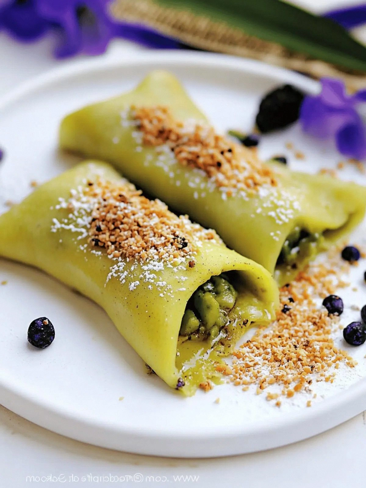 The 5 leaves of fresh pandan are the star of this dish. They infuse the batter with a subtle, sweet aroma that is reminiscent of green tea and citrus. If you use dried leaves, double the amount and steep them longer to achieve the same intensity. Skipping pandan will leave the crepe feeling flat and less complex.